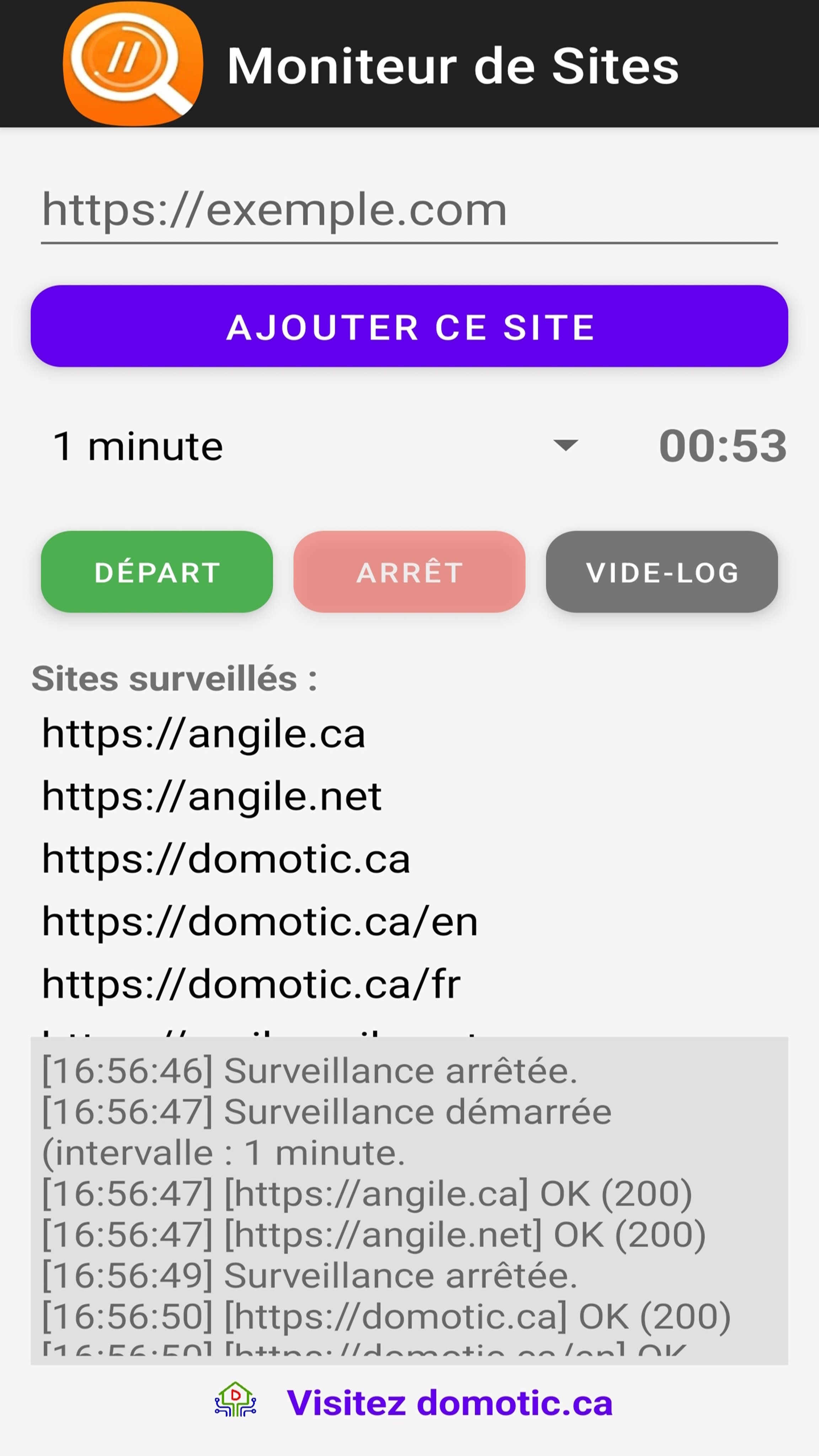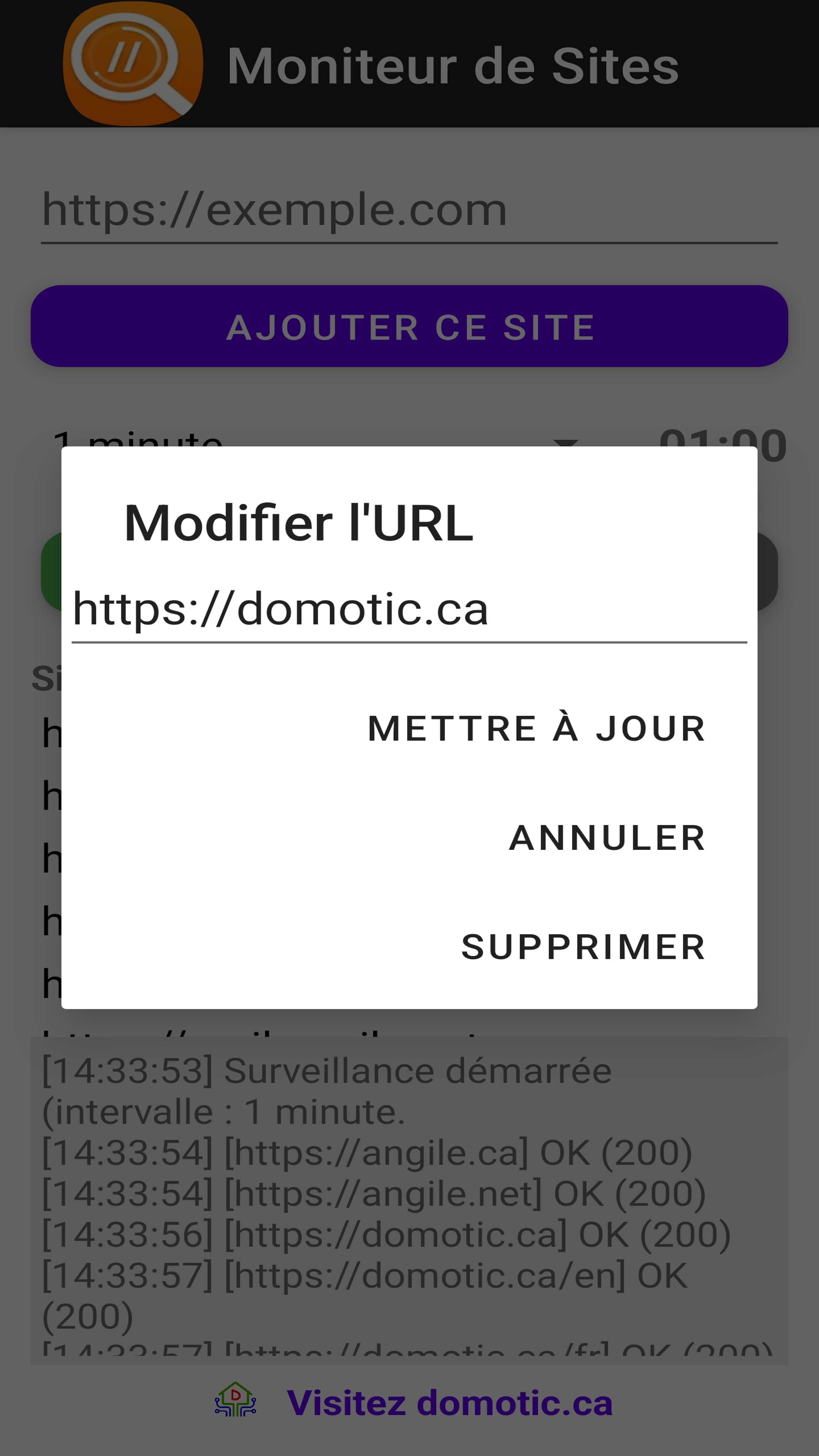- Ajout de sites : Ajoutez plusieurs URLs. L'app doit ajouter "https://" automatiquement si vous l'oubliez.